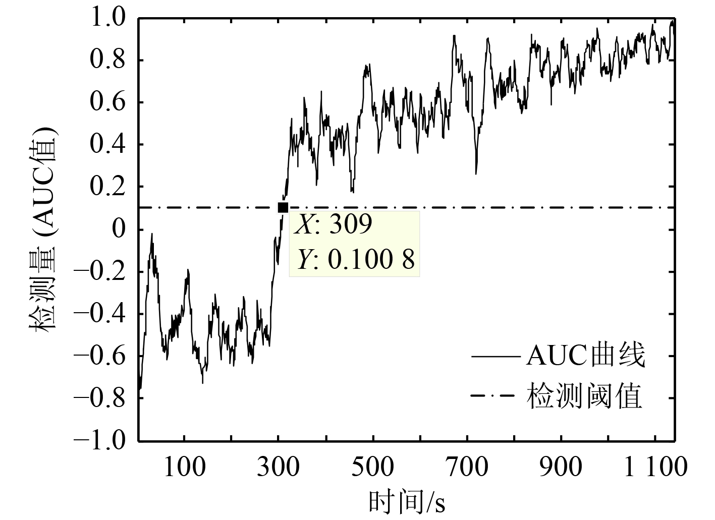 通过展示AUC检测结果示意图,直观地说明本文所提纯方位机动目标检测算法的有效性。不失一般性的设定方位量测误差为0.6°,目标在300 s机动(航向增加60°),利用表1态势题中的“态势1”的态势参数,观察目标机动时,AUC检测量的变化规律以及目标机动检测结果。