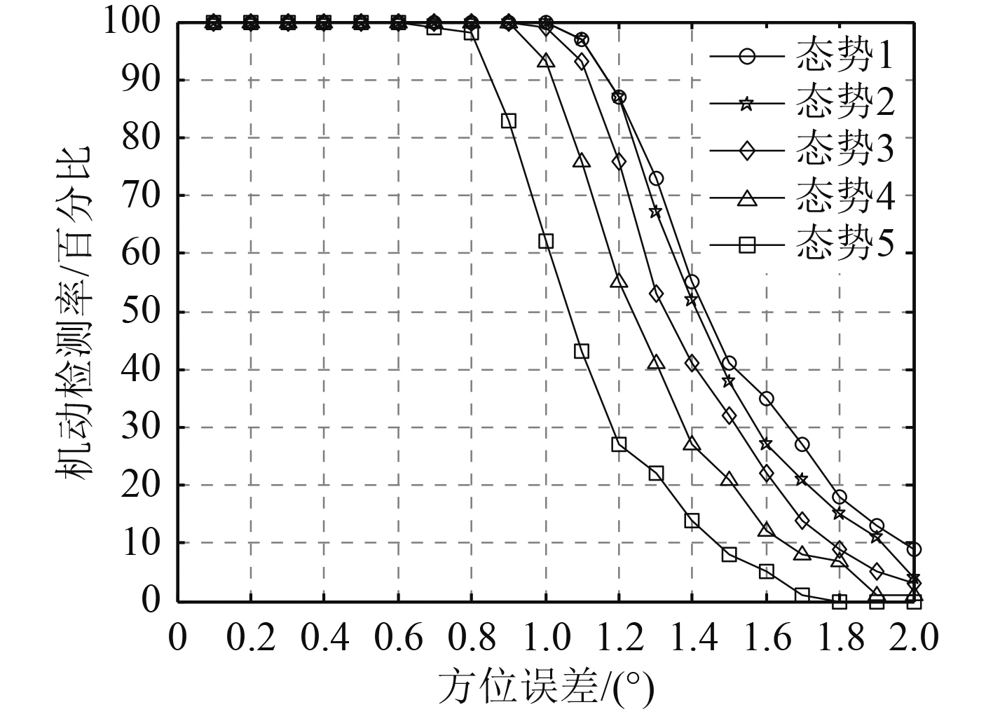 图 4 机动检测率随量测方位误差的变化 Fig. 4 The variation of maneuver identification rate with measurement bearing error |