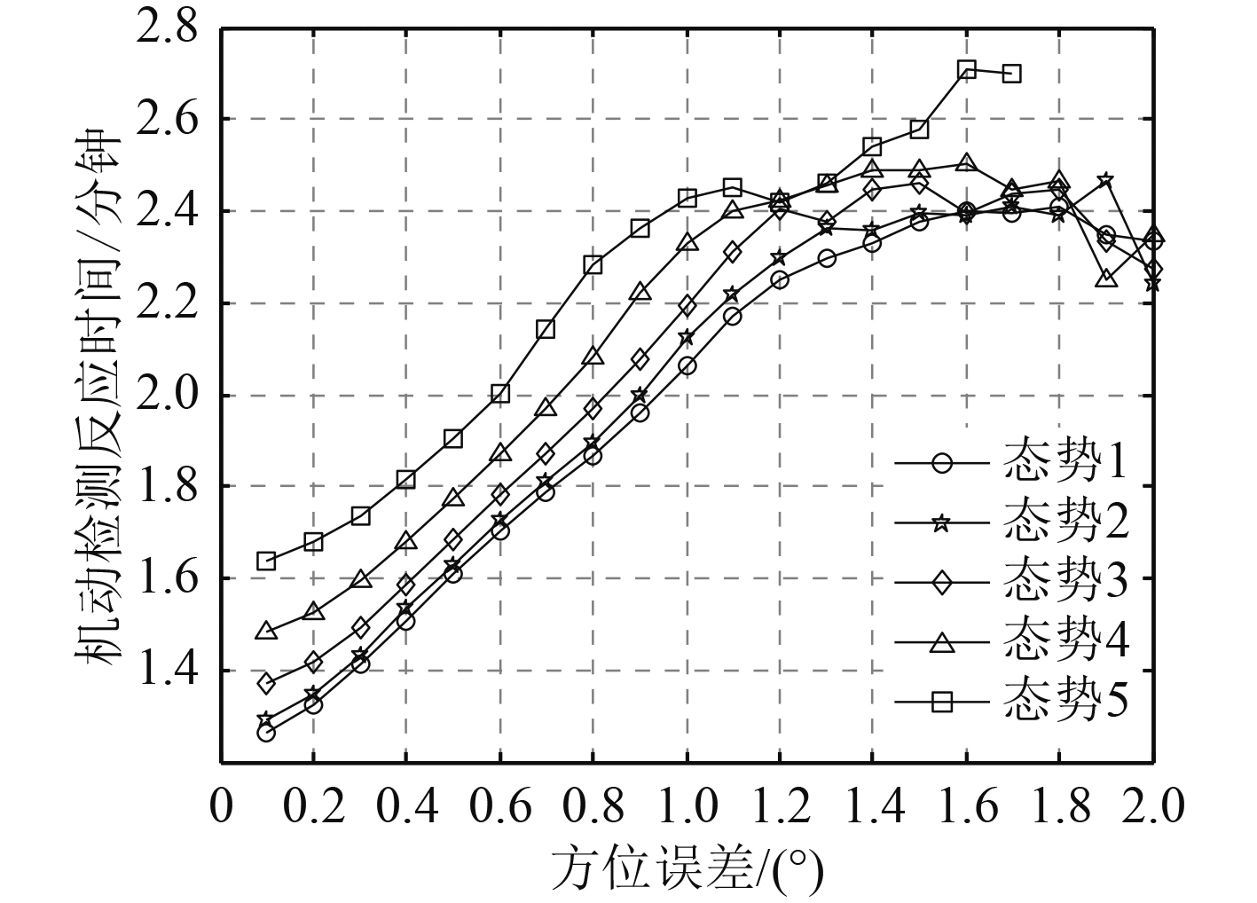 图 5 机动辨识反应时间随量测方位误差的变化 Fig. 5 The variation of maneuver identification reaction time with measurement bearing error |