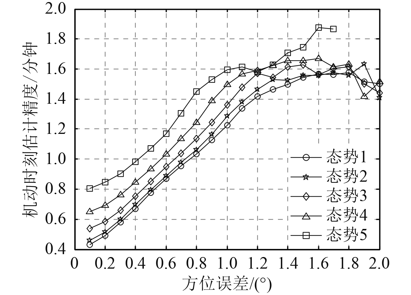 利用计算机仿真可得该组态势的方位序列的变化如图2所示。