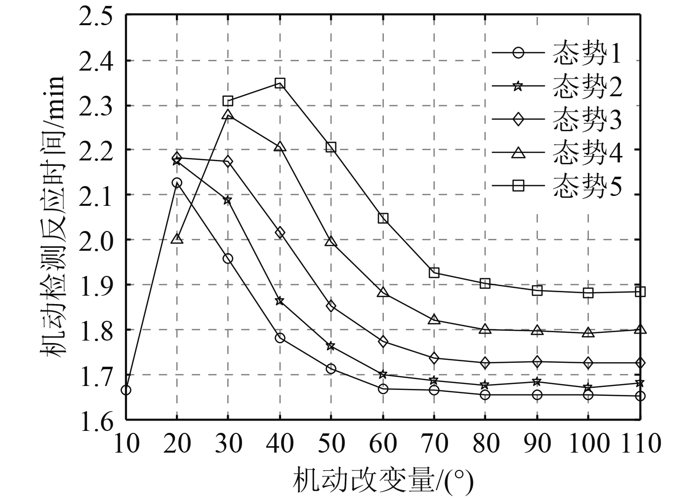 图 8 机动检测反应时间随目标机动量的变化 Fig. 8 The variation of maneuver identification reaction time with maneuvering volume |