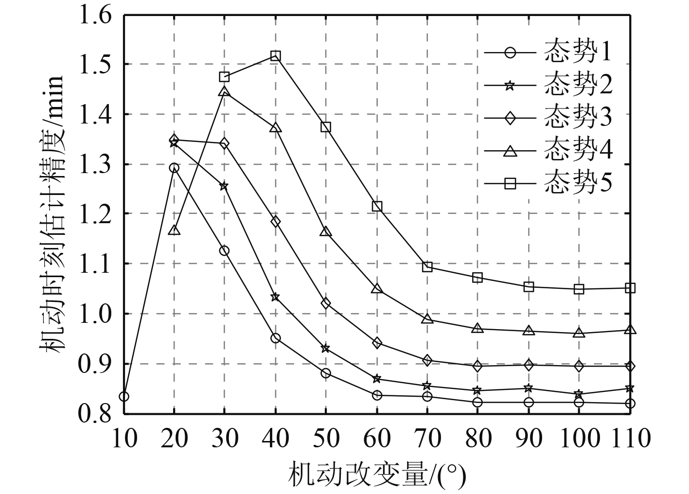 可知,在机动量一定的条件下,随着量测方位误差的增大,所提算法对设定态势题中5个态势的机动检测率从100%降低到0%~9%以下;机动检测反应时间从1.264~1.639 min升高至2.703~2.333 min;目标机动时刻估计误差从0.431~0.805 min升高至1.502~1.867 min。当量测方位误差大于1.7°时,所提算法对态势5的机动检测率为0%。由此可知,机动量一定时,随着量测方位误差的增大,在不同态势下所提算法的机动检测率均降低、机动检测反应时间均增大、机动时刻估计精度均降低。