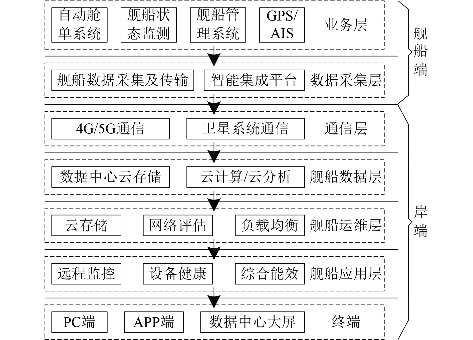 可知,舰船端负责对舰船运行相关数据进行采集和收集,通过岸端通信层将获取的舰船相关数据传输出去,在舰船数据层、运维层和应用层,分别实现舰船运行相关数据的云存储、云计算处理、舰船通信网络状态评估、远程监控等功能,最终通过PC端等终端设备对舰船相关数据进行分析和管理,并将结果显示出来。