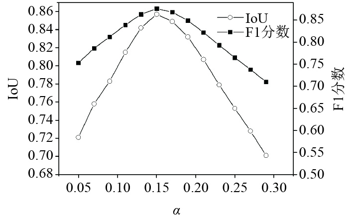 3.1 α敏感性实验分析对α敏感性进行实验,固定λ=0.4,将α从0.05以0.01为步长递增至0.30,每组参数测试100张典型图像(涵盖各尺寸舰船与海况),重复实验3次取均值,得到的实验结果如图1所示,可以发现IoU、F1分数均呈先上升后下降的单峰趋势,在α=0.15时达到峰值。