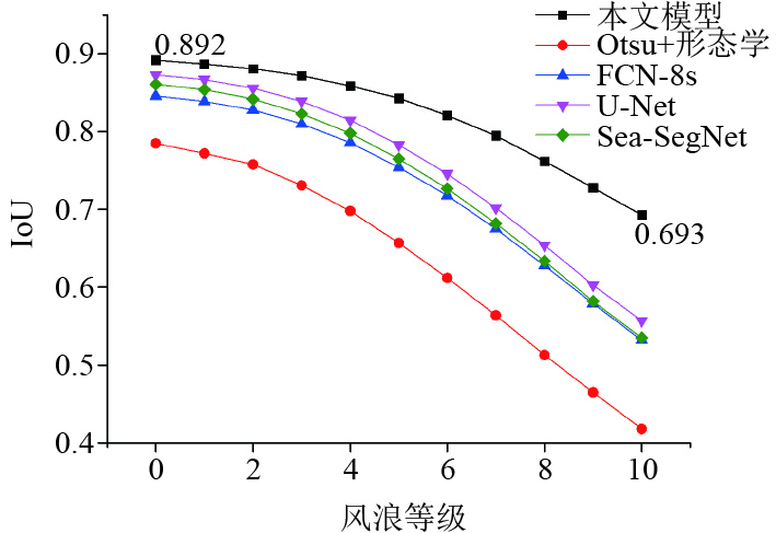 图 3 不同海浪强度下各算法IoU对比 Fig. 3 Comparison of IoU of each algorithm under different wave intensities |