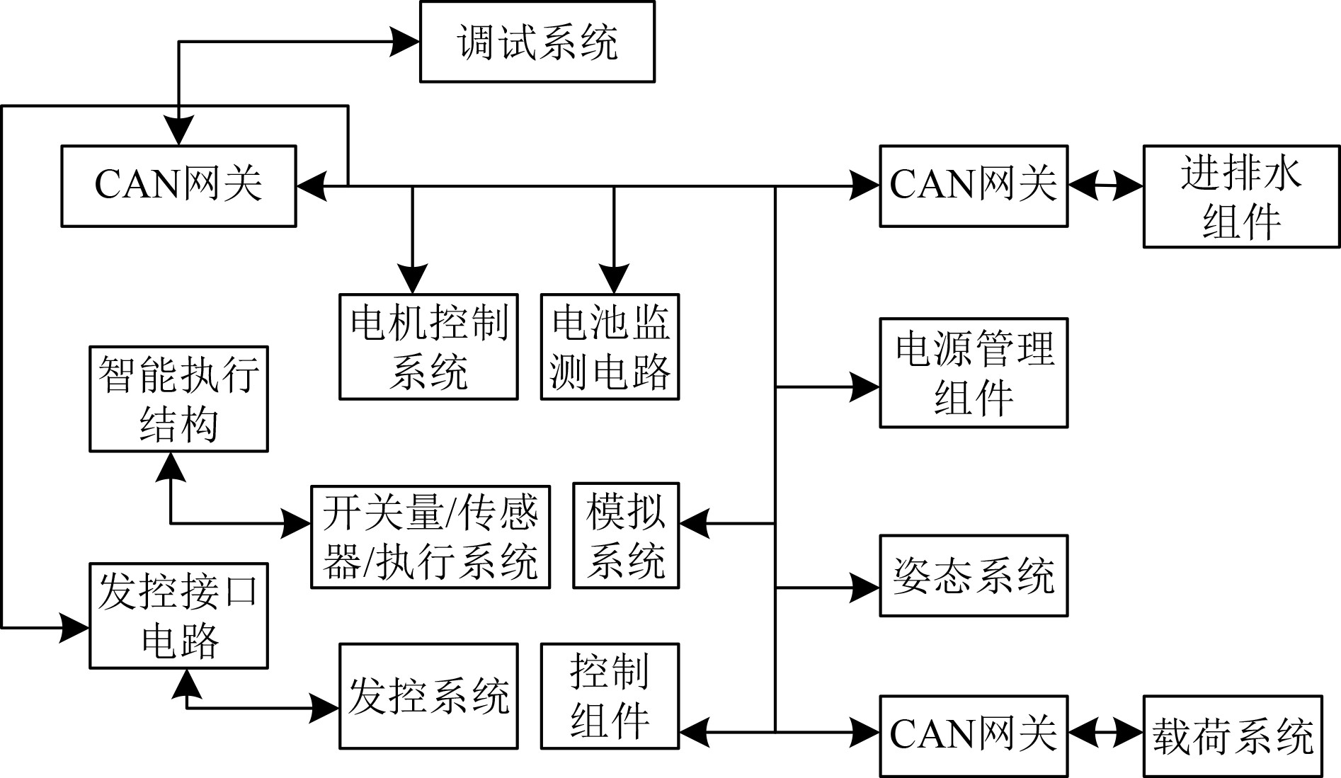 1 舰船关键控制系统的网络安全漏洞挖掘方法 1.1 舰船关键控制系统基本组成结构图1为舰船关键控制系统基本组成结构图。该系统以CAN网络为核心数据交互。调试系统、进排水组件、电机控制系统、电源管理电路、电池监测组件及智能执行机构等均接入此网络,以实现集中式的控制与状态监测。此外,开关量/模拟量系统、姿态系统、传感器/发控接口以及执行机构电路等单元,分别负责数据采集、状态监控与指令执行等特定功能。载荷系统通过CAN网关与控制组件进行关联,电机控制系统也经由CAN网络与其它单元完成数据交互。