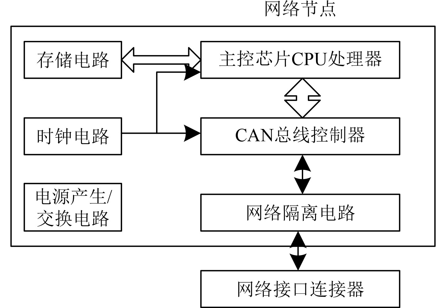 舰船关键控制系统CAN网络一般有1个及以上网络节点,从通信视角可分为主、从节点,不过其组成大致相近。每个节点通常由主控芯片CPU处理器、存储电路、时钟电路、电源产生/变换电路、CAN总线控制器、总线接口电路、网络隔离电路、网络接口连接器等组成(见图2)。其中,CAN总线控制器和主控芯片CPU处理器是电路核心,一旦CAN网络受网络漏洞所影响,会影响舰船关键控制系统的运行状态。