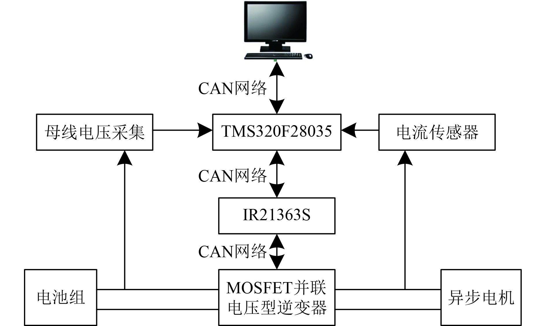 2 仿真实验 2.1 实验场景为验证本文方法的有效性,设计实验,并详细描述了实验环境与配置,以确保实验的可复现性。实验搭建的舰船电机控制系统测试平台如图3所示。核心控制器采用TMS320F28035微控制器。CAN网络通信由ZLG USBCAN−E−U Pro分析仪实现数据收发与采集,该设备支持CAN2.0 A/B协议,最高速率1Mb/s。电机驱动部分由IR21363S驱动模块和MOSFET并联构成的电压型逆变器组成,驱动1台额定功率为100 kW、额定转速1500 r/min的异步电机。电机振动数据通过Triaxial Technologies的三轴加速度传感器(型号:603C01)采集,采集频率为140 Hz。
