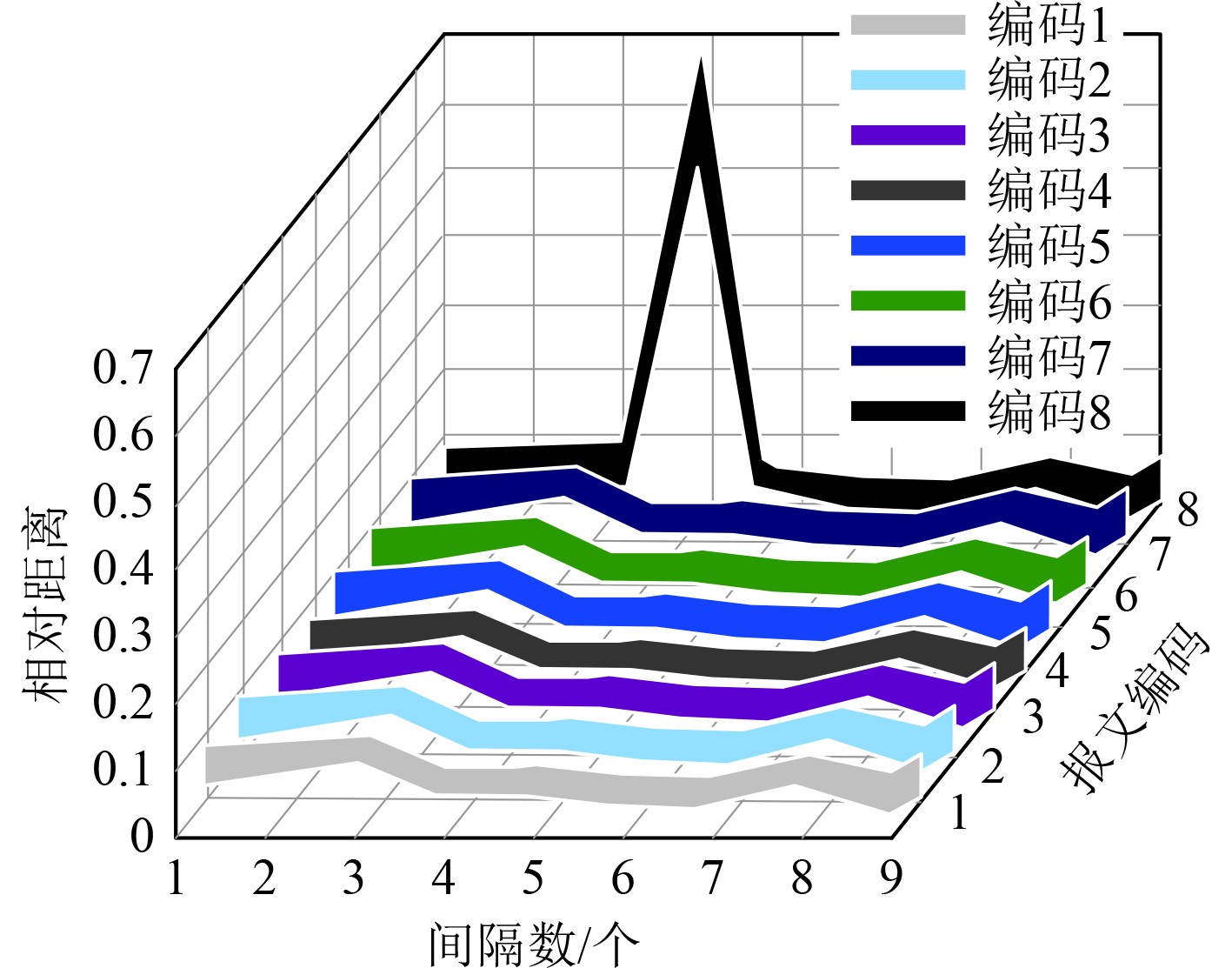 2.2 结果数据与分析实验对CAN控制板模拟攻击者在时间间隔10 s内重放报文,建立网络漏洞环境。上位机使用本文方法通过计算不同报文在相邻时间间隔的相对距离来判断是否有重放漏洞。表2为实验用的8种CAN报文的ID、周期、数据长度。实验设定9个时间间隔,则在正常状态下、漏洞状态下,本文方法对CAN报文的相对距离计算结果如图4所示,图4中横坐标为9个连续时间间隔,纵坐标为计算的KL相对距离。从图4可知,大部分报文(编码1~7)相对距离维持在较低水平(0.2区间内),随间隔数变化波动极小,这与正常时报文分布稳定、相对距离趋近于0的理论一致,验证了本文方法对正常状态的识别能力。而报文8有显著峰值曲线(相对距离骤升至0.6以上),表明其在漏洞状态下分布与正常基线偏差极大。结合重放攻击实验设定,可推断该报文是重放漏洞载体,攻击者重放此报文破坏了网络总线正常报文分布。由此可见,本文方法结合相对距离指标可定位具体漏洞报文ID,为“阻断重放报文、修复漏洞”提供精准依据,对舰船关键控制系统等高安全要求场景有重要应用价值。
