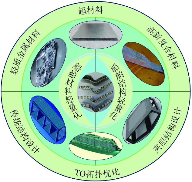 为了应对这一挑战,业界开始探索多种途径。其中,船舶轻量化[3]通过减少船舶重量以提升船舶运行能效、降低能耗,被认为是最有实用价值的解决方案。轻量化是一个跨学科的工程科学[4 - 5],其中涉及包括材料力学、材料学和制造技术等领域的相关知识。为了实现这个目标,需要选择适当的轻质材料、构造、连接技术以确保船舶设计方案的可行性以及船舶制造工艺的可达性。目前船舶轻量化研究可以根据实现途径分为为轻量化材料的应用以及轻量化结构设计2个方面,具体如图1所示。