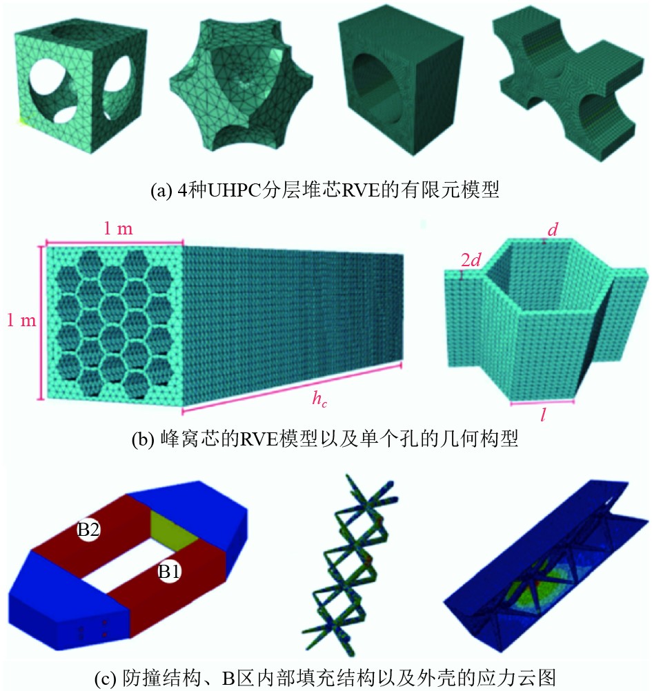 在超材料技术研究方面:李琛等[32]运用增材制造技术,设计制造了蜂窝超材料船底板,通过对比传统的纵/横骨架式船底板的屈曲强度,证明了正泊松比蜂窝超材料在船舶轻量化和承载能力方面的潜力。Mohanty等[33]对AUV头部耐压壳进行了轻量化优化,采用四边形蜂窝超材料作为夹层,优化后的结构重量减轻了38%。Hui等[34]通过圆形和正六边形蜂窝结构的超材料,优化了力学性能与孔隙率,得到了轻量化且剪切应力较小的结构。其有限元模型分别如图2(a)和图2(b)所示。Nian等[35 - 37]通过一种轻质晶格超材料在实现船舶轻量化的同时提升结构在船舶冲击载荷作用下的能量吸收特性,该防撞结构、内部填充结构的应力云图以及外壳应力云图如图2(c)所示。
