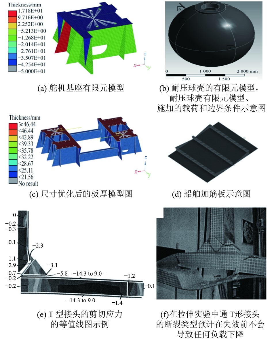 佘小林等[38]通过应力、位移和固有频率等设计约束对船舶基座、管线支架及舵机进行结构优化,为辅助结构的轻量化提供了参考,应力分布如图3(a)和图3(c)所示。高原等[7]利用有限元分析优化了耐压球壳开孔加强结构,显著提升其刚度和承载能力,建模效果如图3(b)所示;黄陈哲等[39]则通过尺寸优化使船舶加筋板减轻了19.2%的重量,加筋板模型如图3(d)所示。此外,在细小结构方面为满足船舶尤其是军用远洋航行对于船舶结构的辅助要求。Helmut等[40]研究出一种用于夹芯板之间 T 形接缝的纤维复合接头,其轻量化 T 型接头的实验强度比原型设计高 20%,重量仅为原设计的 40% 左右,T 形接头的部分实验如图3(e) 和图3(f)所示。梁晓峰等[41]通过形状-尺寸联合优化方法,对雷达桅杆的轮廓和厚度进行了优化,实现了轻量化设计。