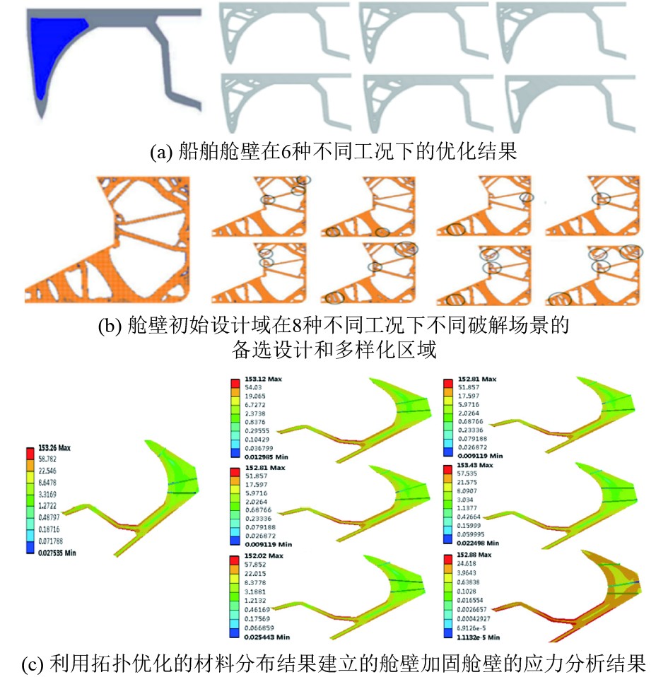 沈晓曦对比了3种拓扑优化方法——具有惩罚的实体各向同性材料方(Solid Isotropic Material with Penalization,SIMP)、渐进结构优化法(Evolutionary Structural Optimization,ESO)和双向进化结构优化法(Bidirectional Evolutionary Structural Optimization,BESO),将SIMP方法用于船舶的拓扑优化,并以体积分数为约束条件对船体板架结构中的横梁部分进行优化,得到优质的轻量化横框架结构,框架优化示意图如4(a)所示。Kendibilir等[42] 为提升舱壁结构抗裂纹性能,采用一种周动力拓扑优化(PD–TO)方法,其舱壁初始设计域在八种不同工况、不同破解场景的备选设计和多样化区域如图4(b)所示。张聪等[43]通过有限元仿真分析了三体船舱壁的应力分布,应用变密度拓扑优化方法,成功将非水密舱壁的结构重量减少了一半,舱壁加固舱壁的应力分析如图4(c)所示。此外,龙周[44]将动态代理模型技术应用于船舶轻量化设计中,提出了一种基于信赖域和主效应分析的动态代理模型优化策略,为船舱节能减重带来了新的思路。