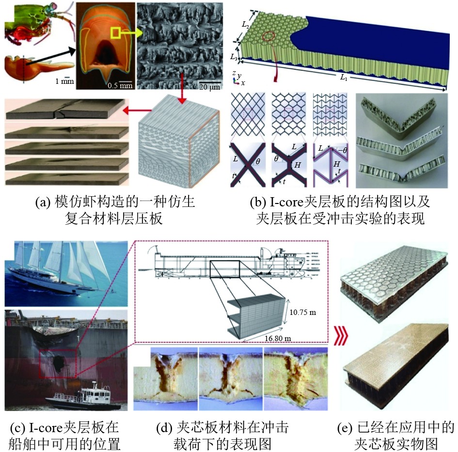 全金属夹层结构一般应用在游轮的楼梯、甲板和甲板房等部位。铝泡沫夹层材料(Aluminum Foam Sandwich Material,AFC)[48]因其轻质、高比强度和优良的减震性能,逐渐用于轻型船舶部件,如电梯平台、水密门、舱口和舱壁等,展现出良好的轻量化潜力。图5(a)展示了基于仿生学构造的AFS板材在静态和动态弯曲试验中的表现,证明了其在强度要求下具备出色的减重效果。