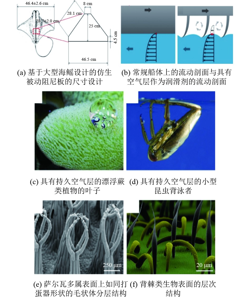 在船舶应用上,Yao等[56]根据海洋中射线的形状和结构特点,设计了一种仿生被动阻尼减摇装置,实验显示该装置在零航速时的减摇效果达到45%~70%,设计如图7(a)所示。Busch等[12]基于Salvinia效应设计一种仿生表面,作为船体上增滑剂时,其在水流中产生的空气层能显著减少阻力,文章对全球75%的船舶类型进行计算,估算该仿生涂层可节省约