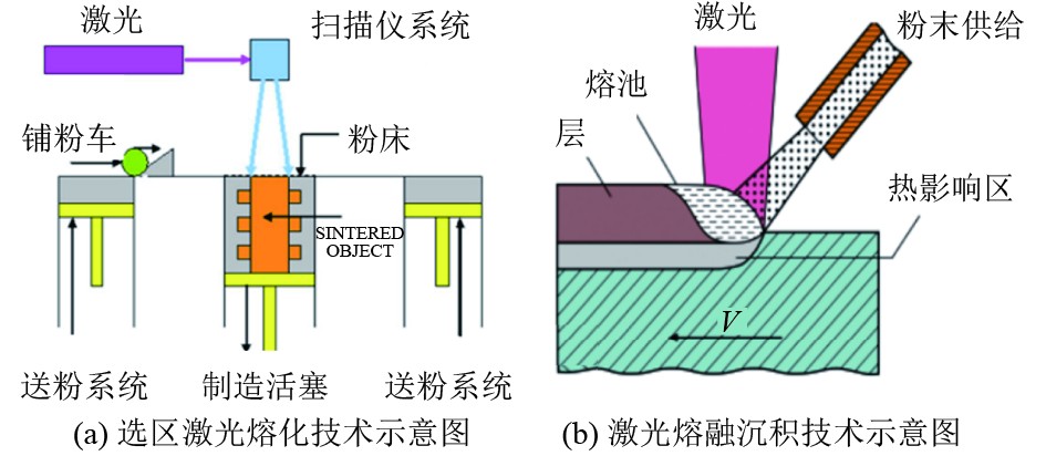 粉末床增材制造技术是一种能够生产金属零件的先进工艺,适用于船舶建造。该技术主要包括激光粉末床熔融[61](Laser Powder Bed Fusion,LPBF)和电子束粉末床熔融[62](Electron Powder Bed Fusion,EPBF)2种方法。选区激光熔化利用激光束的高能量密度将金属材料局部加热至熔点以上,熔化材料后通过控制激光束的移动速度和功率密度,精确控制熔化区域的位置。随着激光束移动,已熔化的区域迅速冷却并凝固,逐层堆积形成完整的金属零件,如图9(a)所示。激光熔融沉积技术则通过逐层熔化金属材料,快速凝固并沉积,以此直接制造出“近净形”的高性能金属零件,无需任何模具或工装,适用于复杂零件的制造,如图9(b)所示。这些技术在船舶制造中,尤其是制造大型船体部件时,展现了高效、灵活的优势,大幅减少了加工时间和成本,同时提升了船体的结构性能。