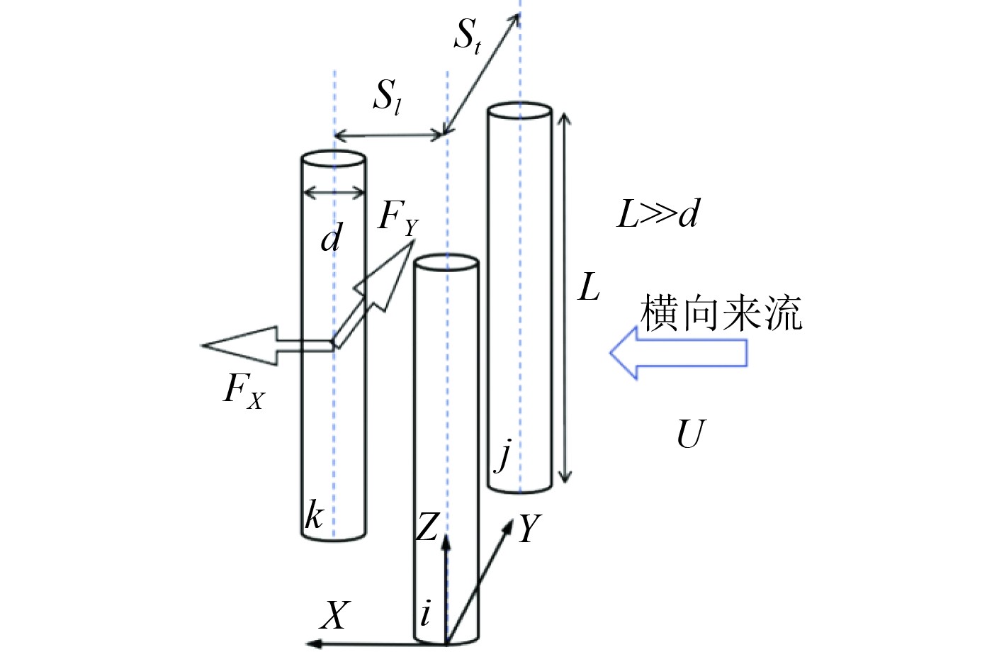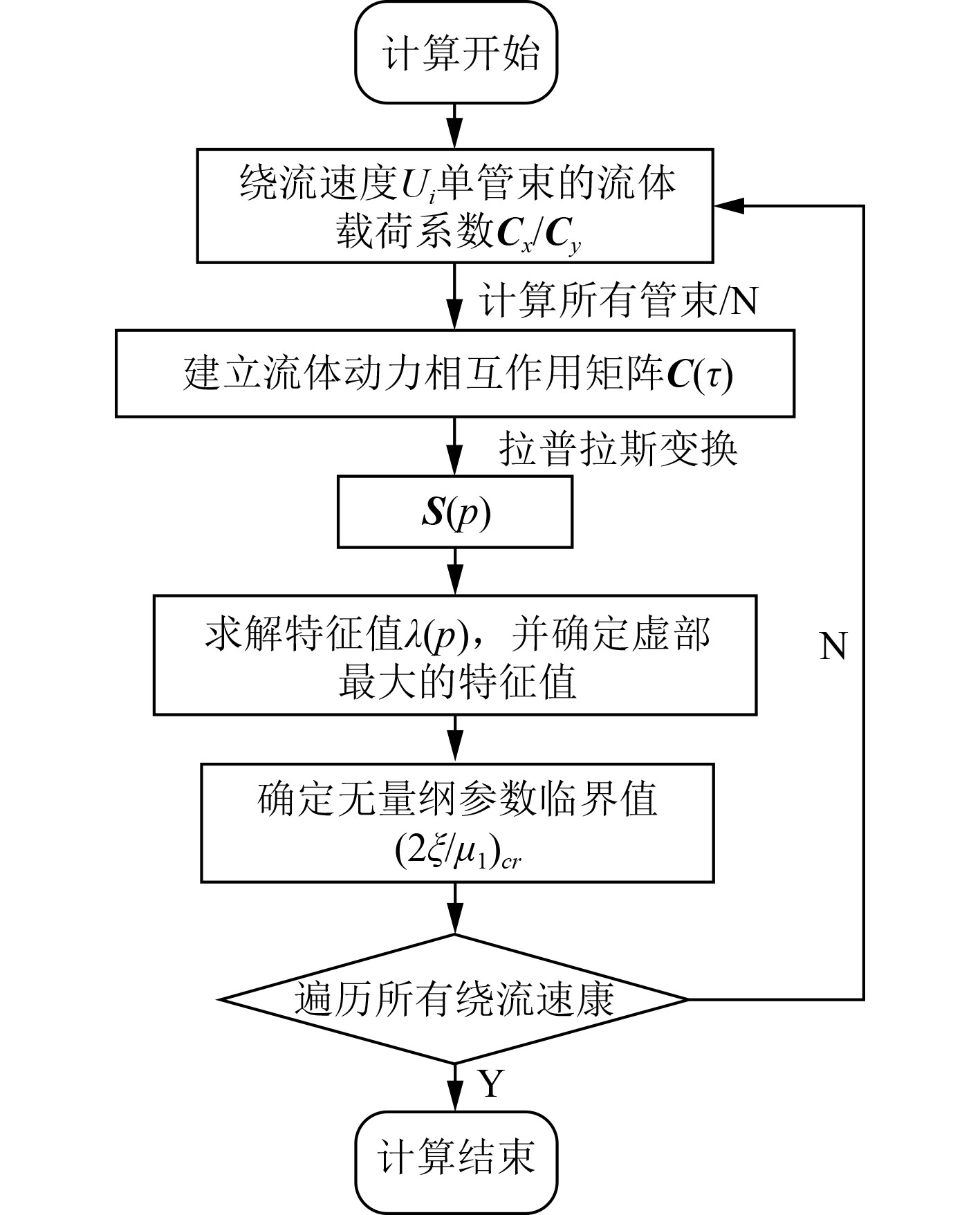 为求解多管束的稳定性边界,首先要计算某一绕流速度下单个管束的流体激励载荷,并组建多管束的流体动力相互作用矩阵