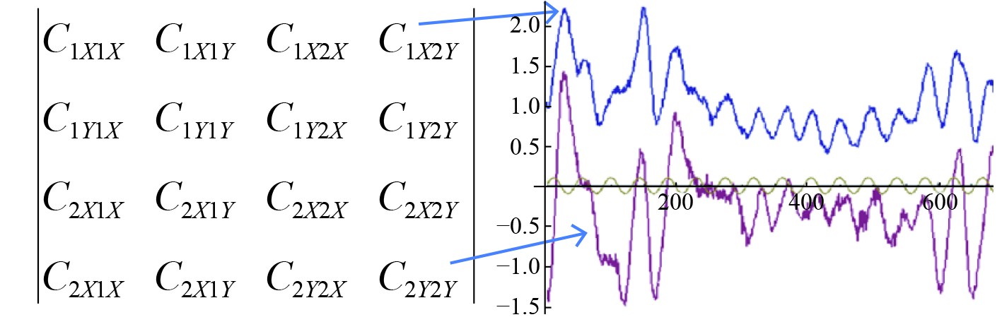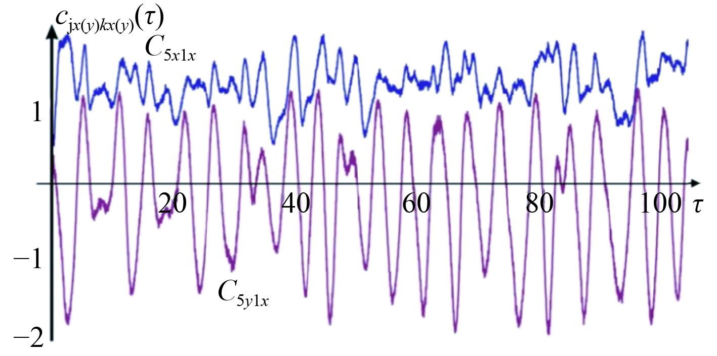 图7针对五管管束的流体动力相互作用矩阵的一个元素片段。展示了在第一根管道沿X轴方向振荡时,作用在第五根管道上的流体动力载荷系数,C5x1x表示第一根管道在X轴方向振动时,作用在第五根管道上沿X轴方向的流体动力载荷系数;C5y1x表示第一根管道在X轴方向振动时,作用在第五根管道上沿Y轴方向的流体动力载荷系数。