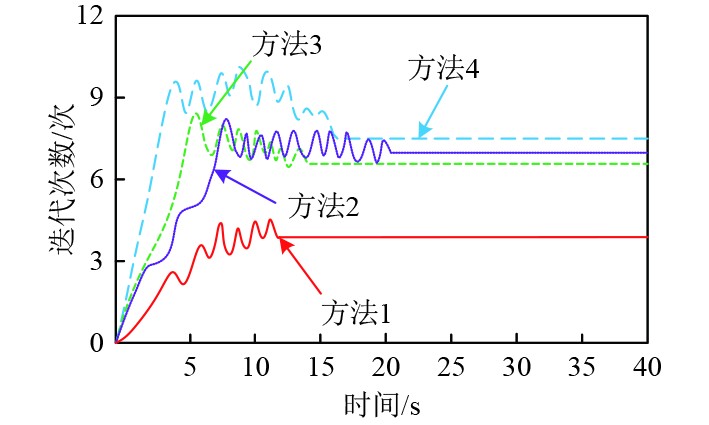 从图2中可知,本文方法在迭代次数上表现优异,迭代曲线增长平缓且最终迭代次数较少,在13 s时所提方法达到稳定,迭代次数稳定在4次。这得益于本文方法针对复杂开放水域特点进行了深度优化,充分考虑了水域中的障碍区域等多种复杂因素,能够快速确定搜索方向,减少无效搜索。而方法2、方法3和方法4的迭代曲线增长较快且最终迭代次数较多,其中,方法2在20 s时达到稳定,迭代次数稳定在7次;方法3在15 s时达到稳定,迭代次数稳定在6.5次;方法4在16 s时达到稳定,迭代次数稳定在8次。综上可知,所提方法可减少迭代次数找到较优路径。