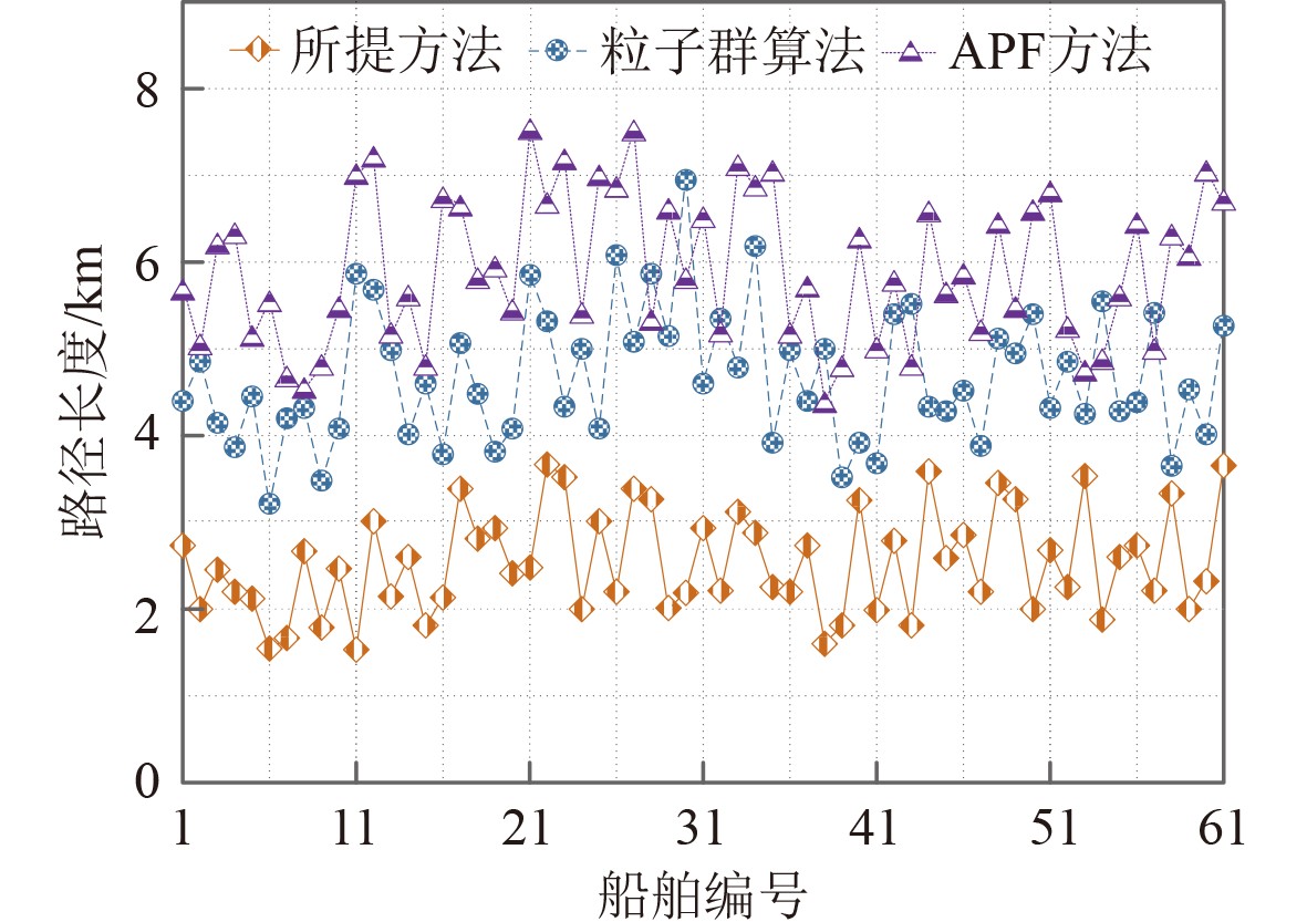 为了进一步比较多智能体深度强化学习应用下多目标船舶避碰决策方法、粒子群算法、APF方法的船舶避碰效率,利用上述3种方法对存在碰撞风险的船舶展开避碰处理,并将规划出的避碰线路长度作为衡量避碰效率的指标,线路越短,表明船舶的避碰效率越高。不同方法下各船舶的避碰线路长度如图5所示。