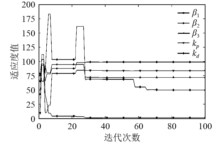 淘金优化器中初始化淘金者数量为10,最大迭代次数100,仿真运行10次,取其中适应度值最小的一次作为优化结果,适应度值如图10所示,参数实时优化过程如图11所示。