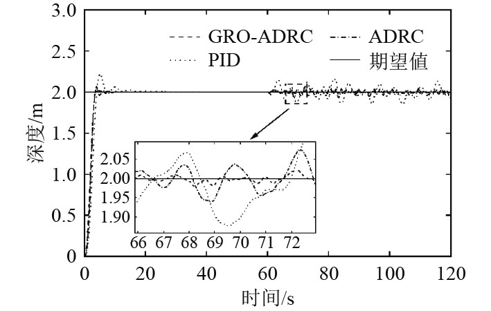 2) 联合GRO对ADRC部分参数进行优化,仿真证明参数优化后的自抗扰控制相较于PID、ADRC控制在深度通道稳态分别降低92%、83%;在艏向角通道稳态误差均降低90%以上。降低参数整定难度,大幅度提高控制效果。