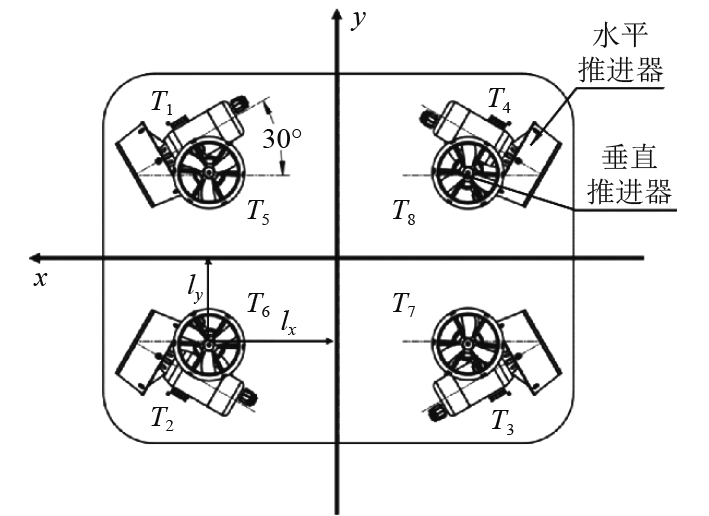 2.4 推进器模型该研究对象采用8个推进器布置,水平面4个推进器与水平线成30°夹角,采用矢量布置;竖直面4个推进器轴线与坐标系竖直坐标轴平行,竖直面推进器距离运动坐标系