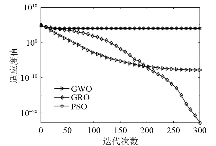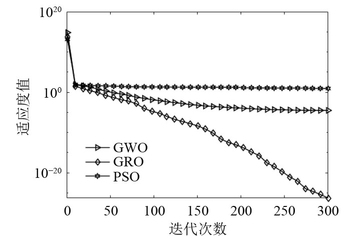 开发能力和探索能力是智能算法的两大特征,已有学者结合智能算法对ADRC参数进行优化,本文选择灰狼优化算法、粒子群算法进行对比。选择CEC2005测试集中单峰测试函数和多峰测试函数各一种进行对比,验证GRO算法的开发与探索性能,测试函数如下: