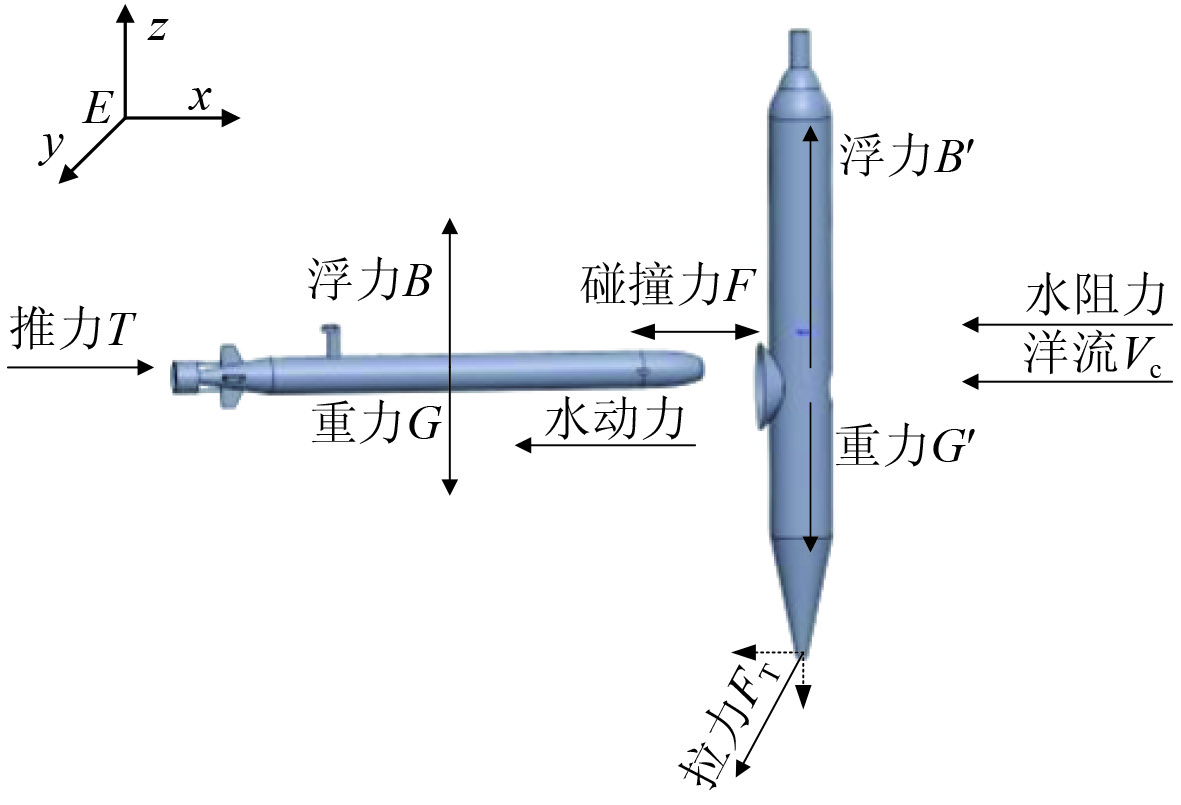 1 AUV对接系统动力学模型本文选取欠驱动式AUV与单点系泊式坞站的末端对接碰撞过程展开研究。对接开始前,给AUV以恒定的纵向推力向前行驶,对该动力学模型作如下假设: