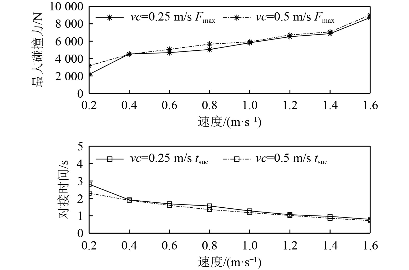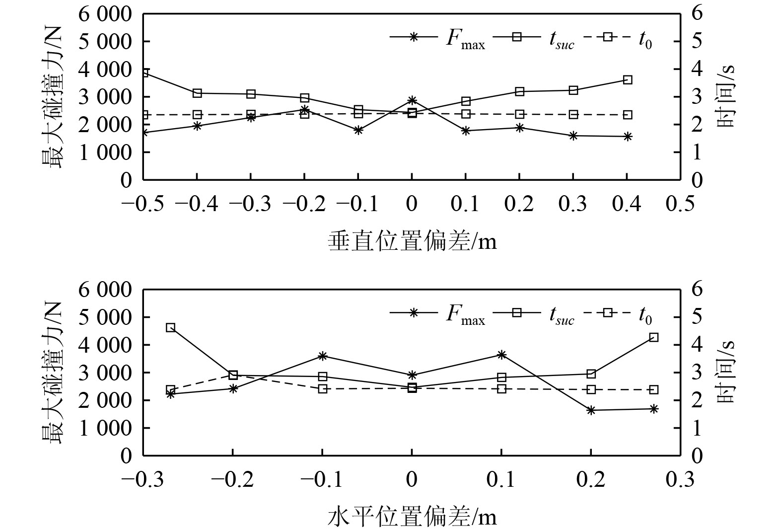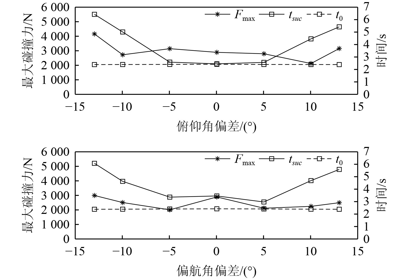 研究不同姿态偏差对AUV对接碰撞影响。保证初始条件不变,只改变偏角进行仿真。图4为不同姿态角下最大碰撞力和对接时间的变化情况。可以看出,随着2个姿态偏角绝对值增加,完成对接的时间也相应增加。整体分析可知,除了零姿态偏差外,俯仰角偏差引起的最大碰撞力要略大于偏航角偏差下的最大碰撞力。而偏航角偏差下的对接时间tsuc略大于俯仰角偏差,但以约5°的偏角进行对接时,对接耗时均最短。当姿态角偏差超过13°时,AUV因角度过大而卡在导向罩收口处无法顺利入坞。