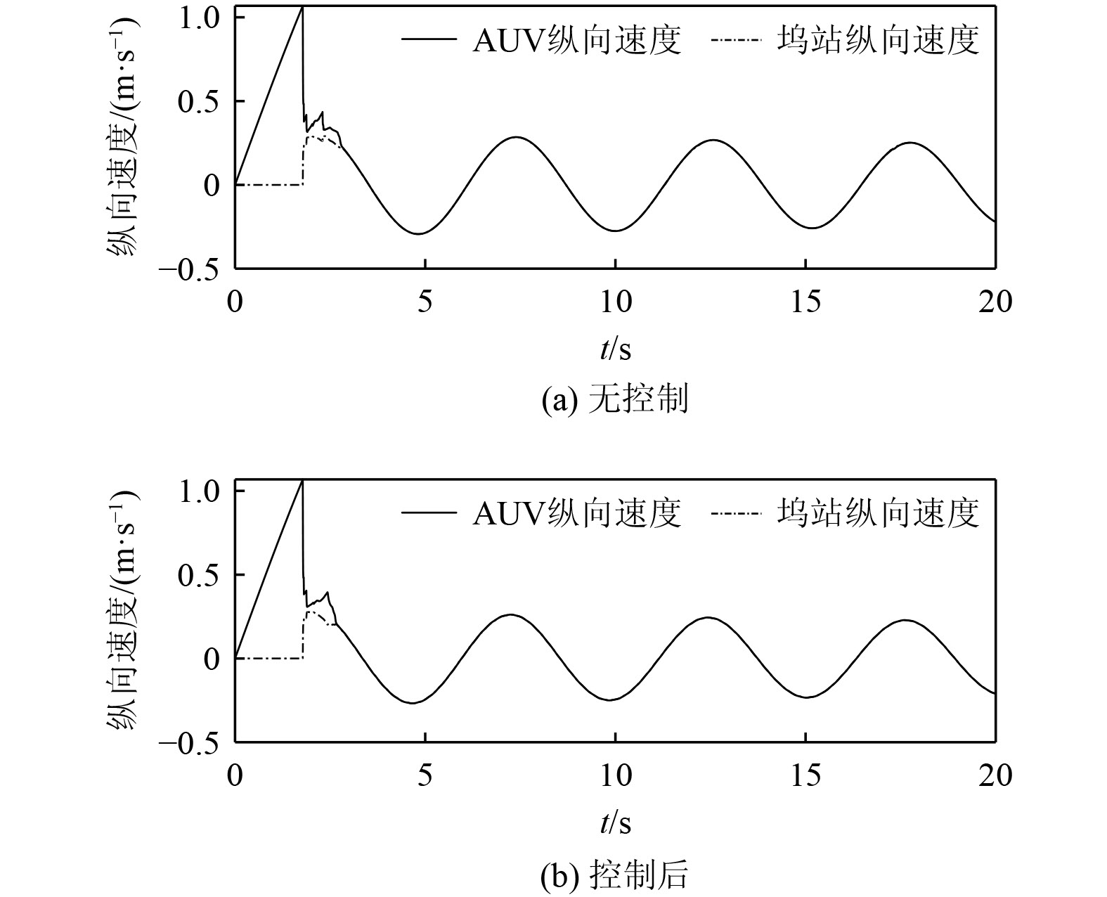 仿真结果如图6~图7所示。由图6可以看出,AUV与坞站碰撞后,速度发生较大的变化,在经过一段时间调整,成功对接坞站并保持同步运动。分析速度响应曲线可知,控制器加入前AUV与坞站碰撞后完成对接需要约2.935 s,控制器加入后AUV需约2.45 s完成对接,提高了对接效率。