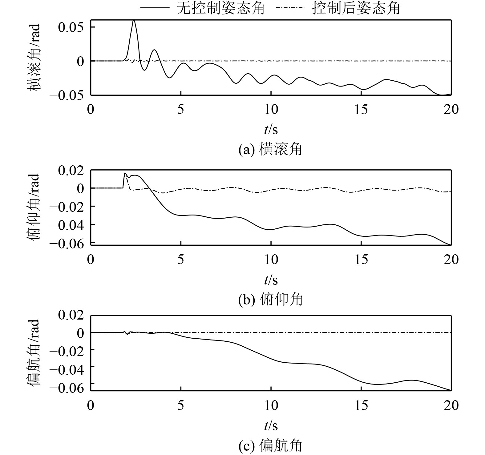 为验证控制系统有效性,在表1的初始条件基础上,初始偏角设置为1 rad,期望姿态角均设置为0,设置控制律参数设为: