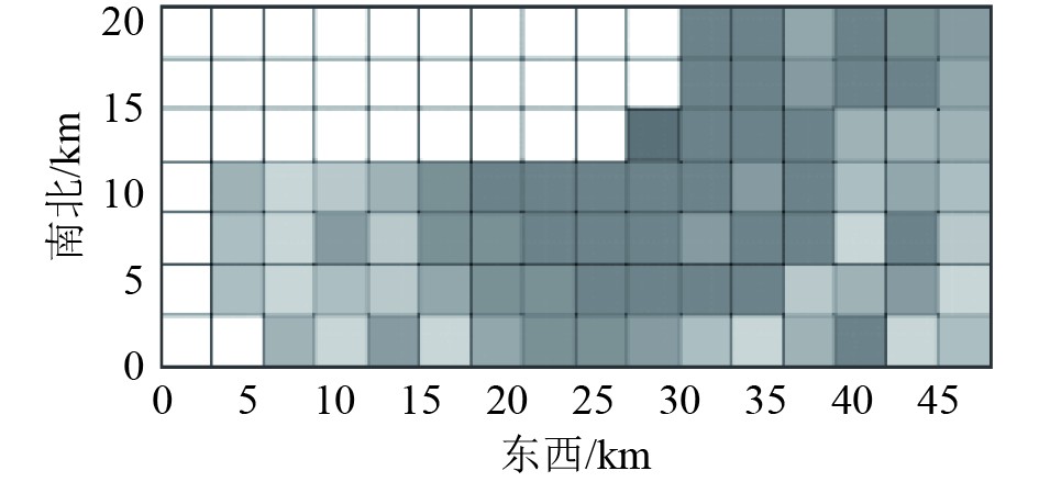 3.1 声场模型仿真结果基于声传播分析环境场进行声传播计算,得到栅格内不同方位的传播损失数据,再将栅格内各个方向上的传播损失数据插值得到覆盖整个任务区域的传播损失数据,仿真结果如图1所示,栅格的颜色越深,代表传播损失越大。