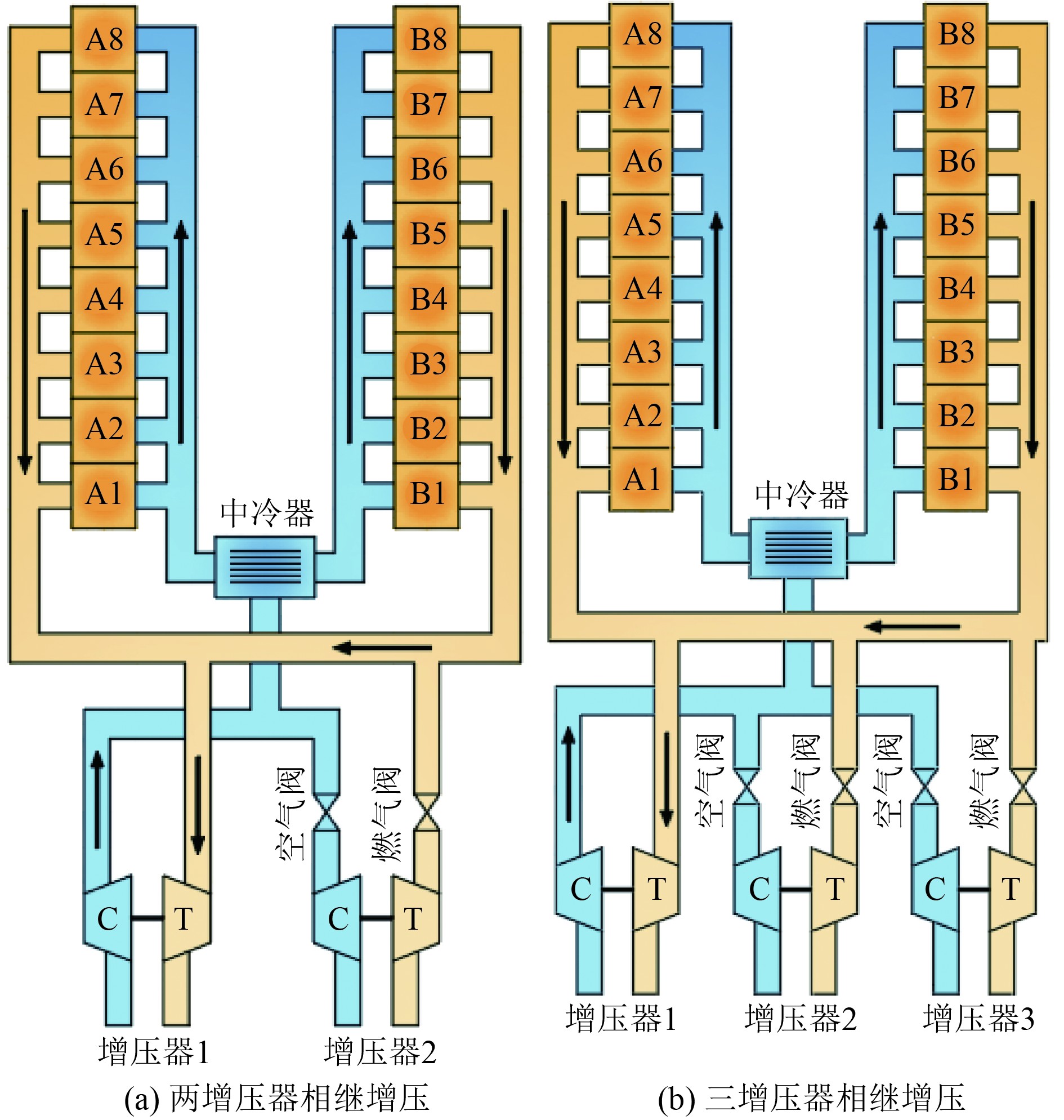 对上述船用V型柴油机进行相继增压系统方案设计,图1(a)为两增压器相继增压系统方案,图1(b)为三增压器相继增压系统方案。其中,增压器1为基本增压器,增压器2、增压器3为受控增压器。在受控增压器涡轮前加装燃气阀,受控压气机后加装空气阀,进气集中后安装中冷器。当柴油机低工况运行时,阀门均关闭,只有基本增压器工作,此时工作状态为1 TC;当负荷逐渐增加,燃气阀与空气阀打开,受控增压器相继投入工作,此时为2 TC或3 TC。