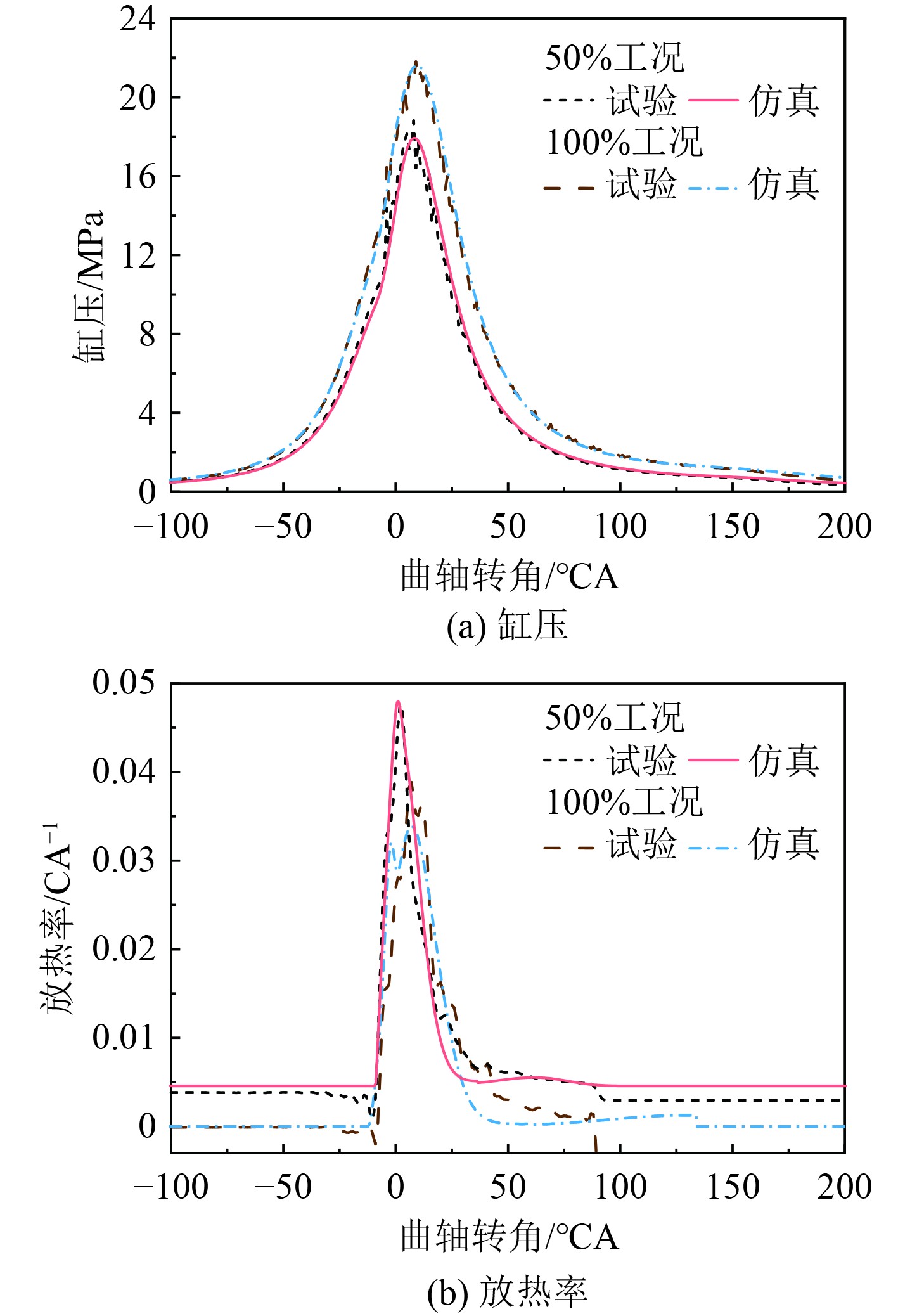 在此模型下对柴油机各运行工况进行了仿真计算。图2为50%及100%工况下柴油机缸压与放热率的试验仿真对比图。可以看出,仿真值与试验值基本吻合,此模型能够体现缸内燃烧过程的特点。
