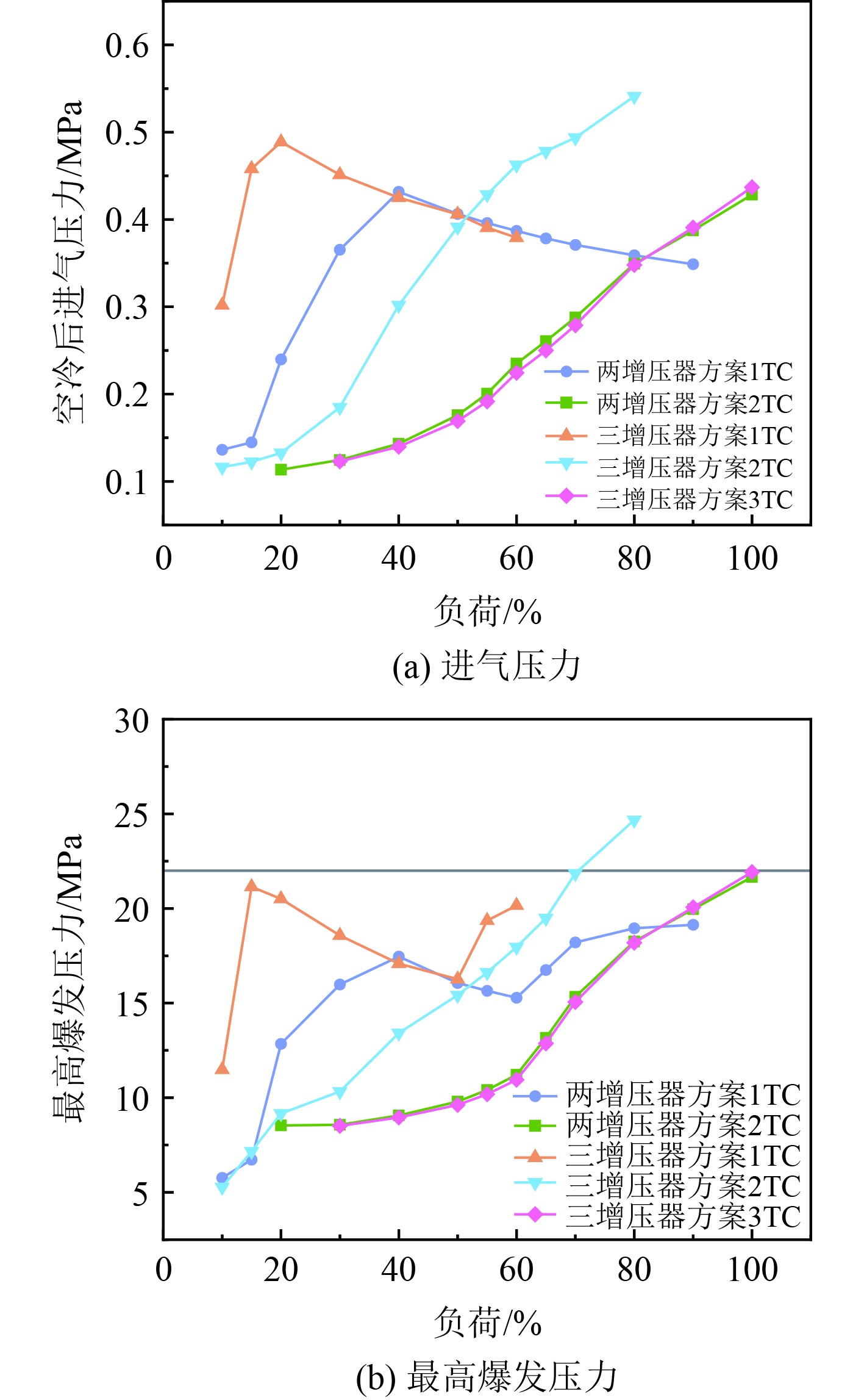 2.1 不同相继增压方案对柴油机性能影响图3为分别采用两增压器与三增压器相继增压时对柴油机进气压力与爆压影响的对比图。由图3(a)可知,2种增压方案1 TC运行工况下的空冷后进气压力均先升高后降低。这是因为单增压器运行时能够增加低工况进气,随着负荷增大,仅一个增压器所能提供的进气量有限,且负荷越大问题越明显。而2 TC与3 TC在高负荷工况下提供的进气压力比较理想。图3(b)为最高爆发压力对比,可以看出,低工况下2种增压方案1 TC的爆压要高于2 TC或3 TC,20%负荷时最为显著。这主要是因为低工况下,柴油机排气量较少,若处于2 TC或3 TC工作状态,废气需流经多个涡轮,每个增压器所获得废气量不足,涡轮效率降低,导致压气机增压压力降低,进入气缸的空气量减少,空燃比下降,燃烧不充分,故爆压较低。在高工况下,多个增压器同时运行时能够提供足够的进气,燃烧效果更好,因此2 TC及3 TC在高工况时爆压较高,其中,三增压器方案在2 TC状态下从70%负荷开始超过爆压限制值22 MPa。