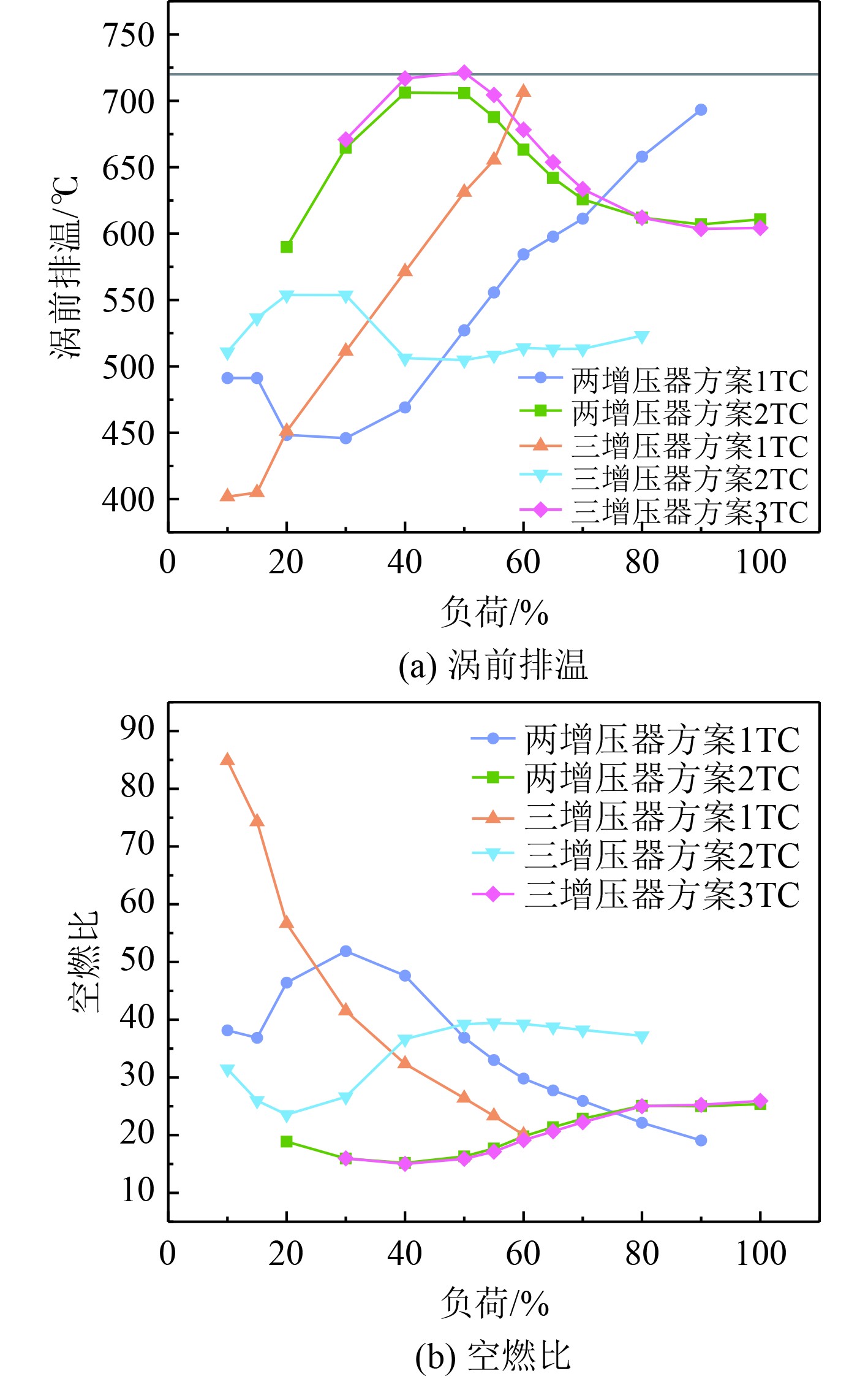 涡前排温方面如图4(a)所示,总体来看2种增压方案各运行工况下均未超过限值720℃。当处于低负荷工况时,1 TC运行状态涡前排温较低,是由于低工况仅一个增压器投入工作时,涡轮转速升高,压气机转速随之升高,增压压力较高,过量空气系数提高,空燃比较高,见图4(b),燃烧效果变好,降低了缸内热负荷,涡前排气温度下降。2 TC与3 TC运行状态的涡前排温都随着负荷增加有段大幅降低,是因为随着负荷增加,2 TC与3 TC有多个增压器同时提供进气,由图4(b)可以看出,此时的空燃比逐渐升高,缸内燃烧充分,涡前排温随之下降。