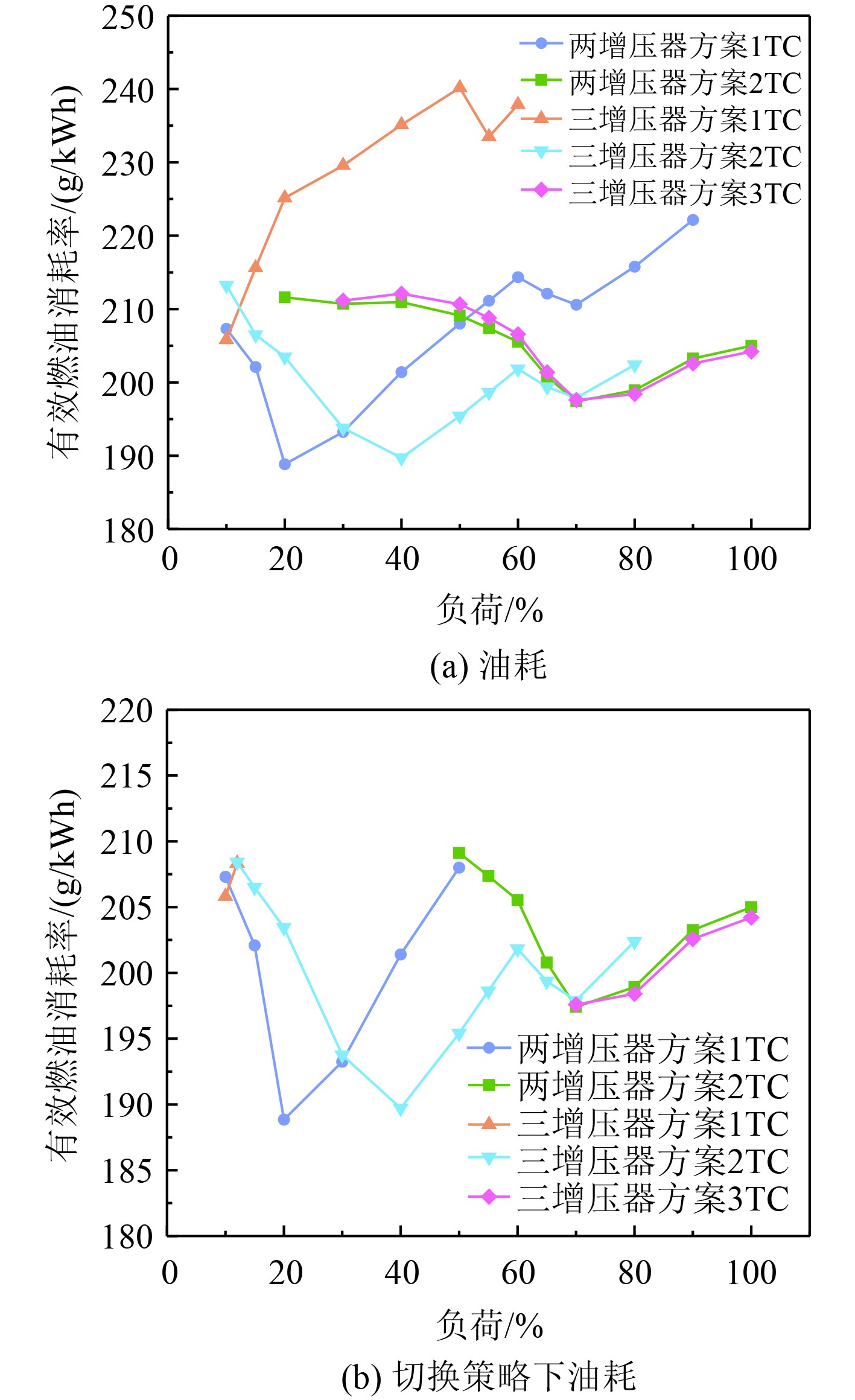 图5(a)为2种增压方案对柴油机经济性的影响。由图可知,10%负荷时1 TC状态下油耗最低,三增压器方案的1 TC油耗比2 TC降低7.4 g/kWh。柴油机采用两增压器方案时,0~50%负荷下1 TC有效燃油消耗率最低,50%~100%负荷下2 TC运行状态油耗低于1 TC。采用三增压器方案,0~12%负荷1 TC条件下油耗最低,2 TC油耗最低负荷区间为12%~70%,高于70%负荷以3 TC运行最为经济。综合考虑上述涡前排温、爆压等限制因素,相继增压切换控制策略为:两增压器方案于50%负荷由1 TC切换至 2 TC;三增压器方案低于12%负荷为1 TC,在12%负荷1 TC切换至2 TC,到70%负荷时将2 TC切换至3 TC。