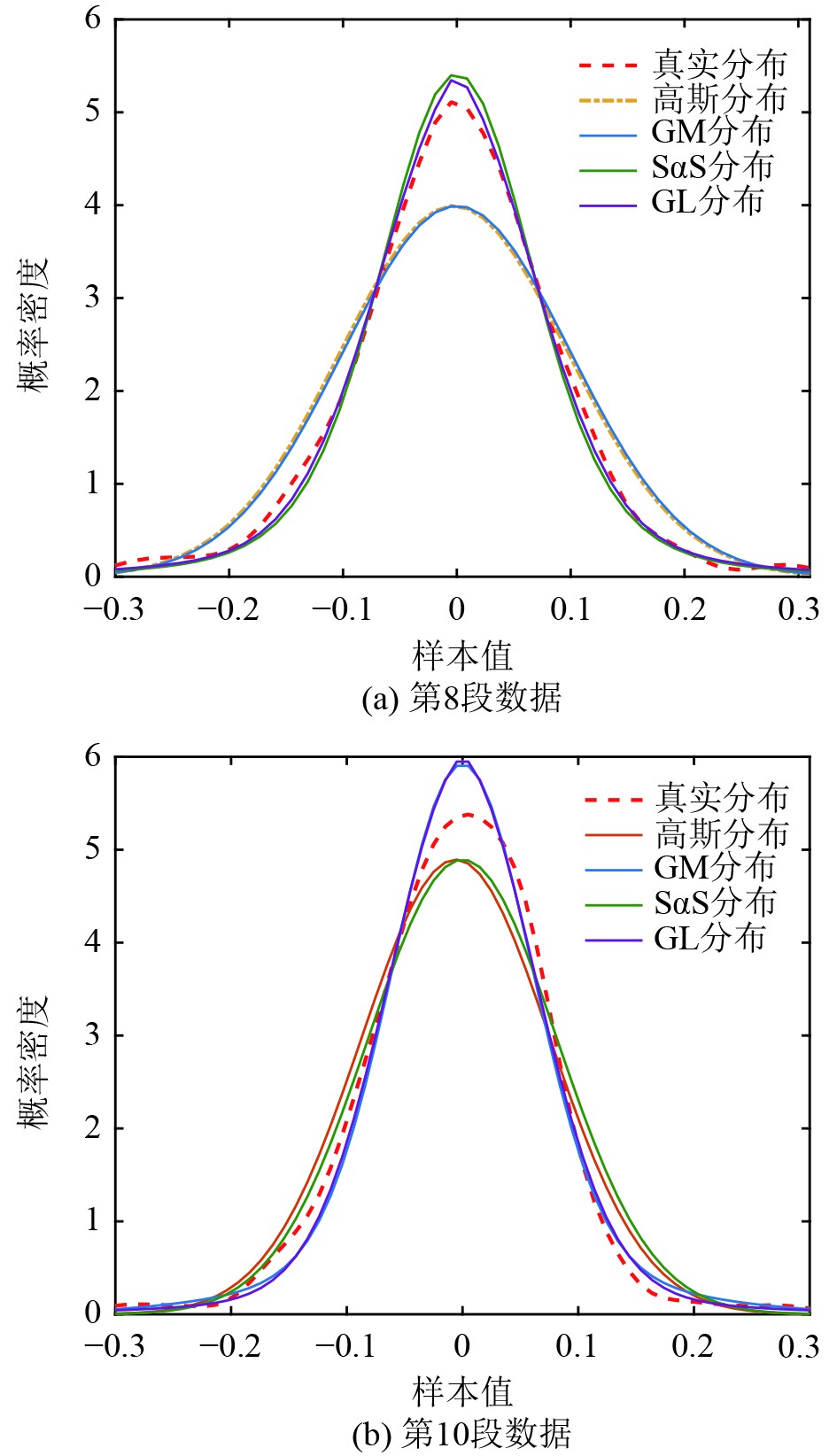 图5分别给出了第8段数据和第10段数据的建模结果。整体来看,高斯分布模型建模结果与理论值偏差较大,表明混响数据呈现出非高斯特性。其次,从图5(a)可知,对于第8段混响数据,GL分布模型和SαS分布模型建模结果与理论值偏差较小;而对于第10段混响数据,从图5(b)可知GL分布模型和GM分布模型建模结果与理论值偏差较小。图5表明,对于不同的数据段,混响的概率密度特性确实有所不同,并且SαS分布模型和GM分布模型各有适用,但GL分布模型建模结果与真实分布偏差始终较小,表现出建模的稳健性。
