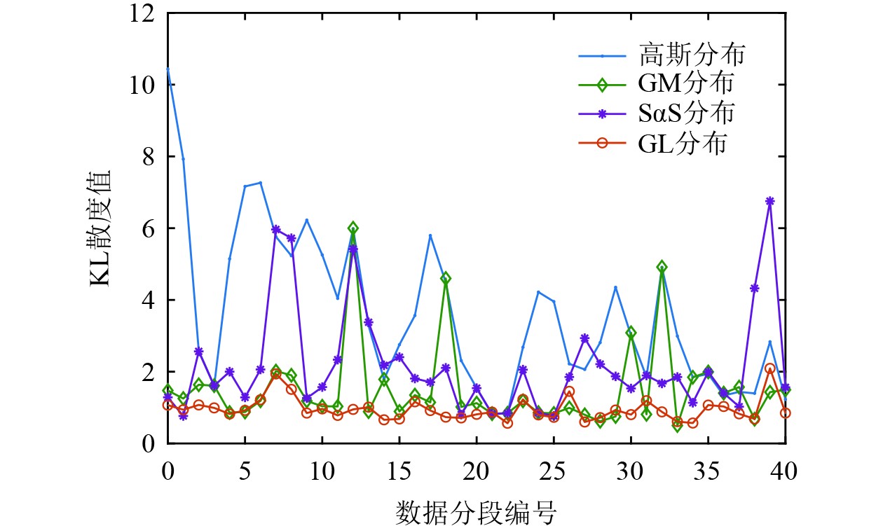 从图6中首先可知,采用高斯分布模型建模的KL散度值普遍较高,说明混响的非高斯性较强。其次,采用GM分布模型和SαS分布模型建模,其整体KL散度值相比高斯分布模型建模低,但起伏较大,有的数据段GM分布模型的KL散度值低,有的数据段则SαS分布模型的KL散度值低,这表明无论GM分布模型还是SαS分布模型,都无法做到始终准确对海洋混响建模,稳健性较弱。最后可知,采用GL分布模型建模,不仅KL散度曲线较为平滑,且取值始终较低,这表明GL分布模型建模与混响真实概率密度的偏差始终较小,稳健性强。