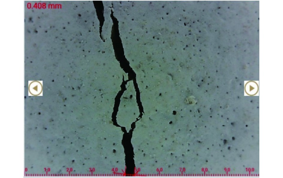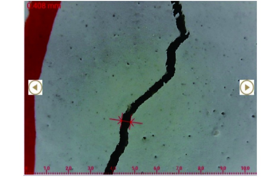 2)采用裂缝观测仪量测裂缝宽度。测量时取与裂缝走向平行的裂缝区段测定,一般应选3条目估最大裂缝测量,取其中最大值为最大裂缝宽度。垂直裂缝的宽度应在结构构件的侧面相应于主筋高度处测量,斜裂缝的宽度应在斜裂缝与箍筋或斜裂缝与弯起钢筋交汇处量测。裂缝宽度数据应量取至0.01 mm。