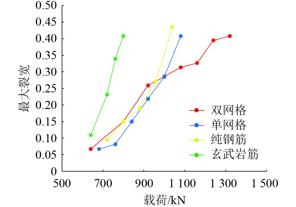 2号箱型梁(玄武岩筋)在加载到520 kN时,采用位移加载,当裂宽大于0.4 mm时,视为混凝土完全破坏,不再记录裂纹宽度,极限载荷