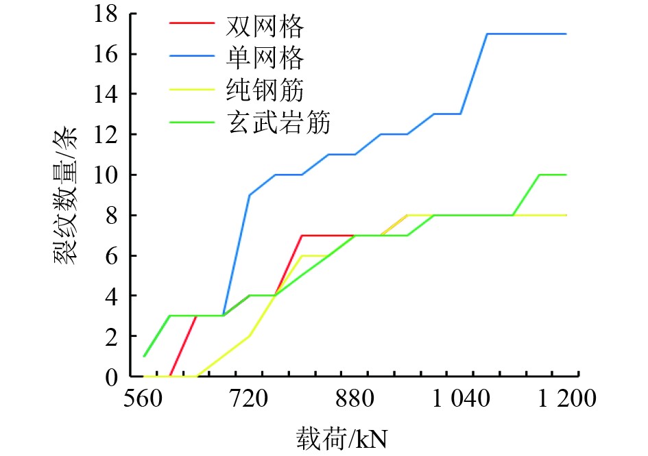 3 试验结果与分析 3.1 极限强度通过表2和图9(a)~图9(d)载荷位移曲线,发现玄武岩筋替代钢筋对箱型梁的承载力有明显负面效果,极限载荷从160 t降低到108 t,降幅超过30%。钢筋梁极限承载力为160 t,其较高的承载力表明,钢筋作为传统增强材料,在抗拉强度和结构整体性方面表现优异,能够有效承担较大荷载。玄武岩筋梁极限承载力为108 t,为4种梁中最低,这一结果表明,玄武岩筋作为纤维增强材料,尽管具有轻质、耐腐蚀等优点,但其抗拉强度和与混凝土的粘结性能可能较弱,导致整体承载力较低。单层网格梁极限承载力为149 t,介于钢筋梁与玄武岩筋梁之间。单层网格结构在一定程度上优化了荷载分布,但其承载力仍低于钢筋梁,表明单层网格在结构刚度和材料利用率方面存在一定局限性。双层网格梁极限承载力为167 t,为4种梁中最高。双层网格结构通过增加网格层数显著提高了整体刚度和荷载分布效率,其承载力甚至超过了传统钢筋梁,表明其在结构优化和材料性能利用方面具有显著优势。