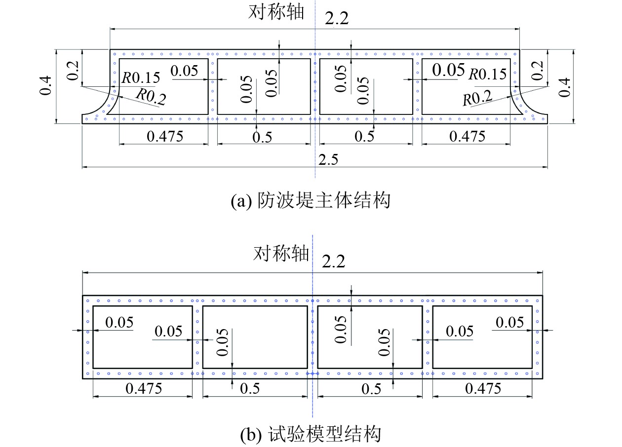 由于防波堤原型为翼状箱型结构,且其中配筋情况较为复杂,为尽量保证缩尺模型与原型的相似性,本试验考虑以下2条相似准则:1)几何相似;2)抗弯强度相似。图3(a)为防波堤主体结构的断面图,上宽为44 m,下宽为50 m,高为8 m,长为75 m,厚度为25 cm。考虑的翼型结构主要作用在减少上浪,且开展静载试验的目的是为了研究玄武岩纤维材料的力学性能,规则的几何结构更具有普适性。因此将图3(a)模型简化成图3(b)进行试验研究。