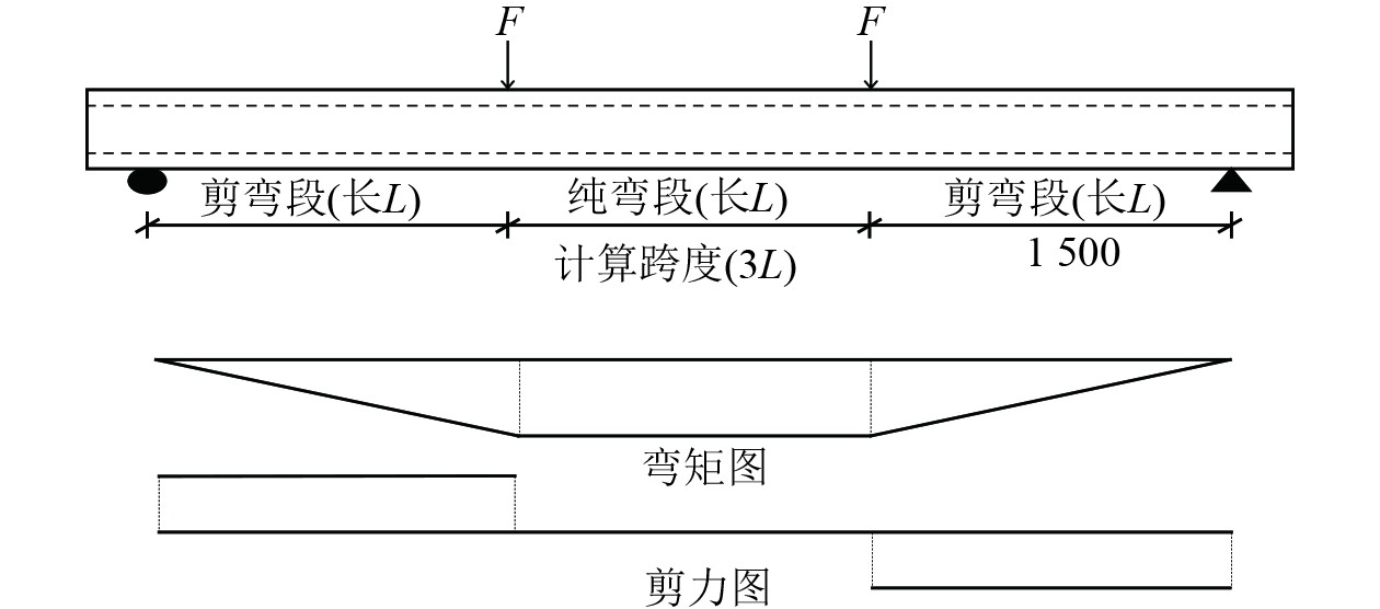 根据试验需要,设计3组缩尺模型。L1为钢筋混凝土模型;L2为玄武岩筋混凝土模型;L3为玄武岩纤维网增强的钢筋混凝土模型。以上3个模型具有相同的截面和配筋。试验采用2点对称加载,在对称集中荷载F作用下,受力点与支座之间为剪弯段,2个受力点之间为纯弯段,如图4所示。