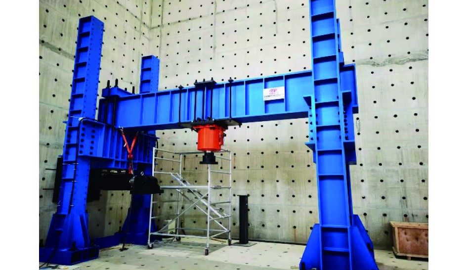 本文共浇筑了4组浮式防波堤主体结构,分别为钢筋混凝土主体结构、玄武岩筋混凝土主体结构、单层玄武岩网格主体结构、双层玄武岩主体结构。试验中混凝土设计强度为C50,采用的受力钢筋为直径为10 mm的HRB500级钢筋,屈服强度不低于500 MPa;箍筋采用直径为6 mm的HPB300级钢筋,屈服强度不低于300 MPa。试验机采用江苏科技大学重装实验室大型加载试验系统,能够进行静载试验,利用其垂向作动器,量程为400 t(超过抗弯梁抗弯极限强度),作动器精度达到1%。反力架尺寸为6 m×3 m×5 m,可以针对长度5 m的梁开展抗弯性能试验。图5为本试验拟采用的大型加载试验系统。支座设计如图6所示。该试验系统配备试验所需的测量仪器,配置裂缝检测仪与应变仪等相关测量仪器。图7为试验相关测试设备。