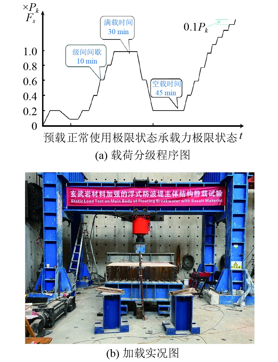 根据经验公式估算标准载荷Pk,玄武岩筋混凝土结构Pk为98 t,钢筋混凝土结构Pk为152 t,以标准载荷Pk作为依据设计分级加载过程。依据图8(a)所示的静载试验加载程序,首先进行预加载(可使试件各部位接触良好,进入正常工作状态,荷载与变形关系趋于稳定;另外,预载可以检验全部试验装置与观测仪表的正常与否),荷载最大值为0.6Pk,分两级加载,之后卸载至0.2Pk;然后进行标准载荷的分级加载过程(验证正常使用极限状态下的结构的刚度及裂缝开裂情况),荷载从0.2Pk,依次增加至0.4Pk、0.6Pk、0.8Pk、1.0Pk,相邻级间间歇约15 min,达到满载后持续30 min以上,之后分两级卸载至0.2Pk;空载50 min,进行极限载荷的分级加载(确定承载能力接线状态下结构的极限承载能力),初始载荷增加量为0.2Pk,随后每级载荷增量逐渐减小至0.1Pk,至结构完全破坏,每级间歇时间设置为10~15 min。试验过程中保持录像,记录试验数据。加载实况如图8(b)所示。