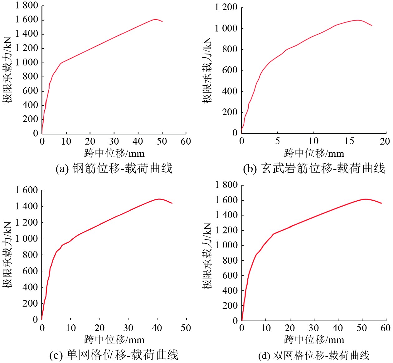 2)纯钢筋和玄武岩筋材料的刚度较低,变形量较大。双网格和单网格材料在较高载荷下仍能保持较小的变形,表现出优异的承载能力;相比之下,纯钢筋和玄武岩筋材料在较低载荷下即表现出较大变形,其承载能力相对较弱。