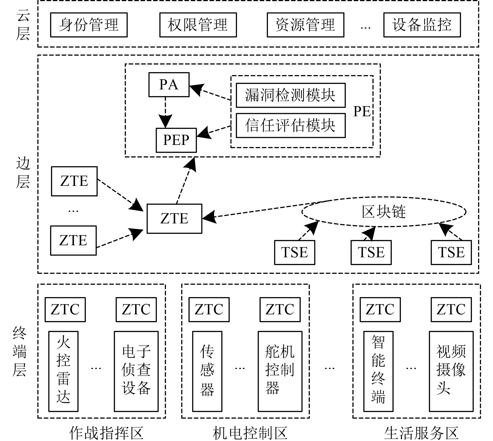 1)终端层。该层由舰船上种类繁多的物联网终端构建而成,包含多类型传感器、智能仪表、各类执行器等。利用集成于各舰船物联网终端上的ZTC进行实时环境感知,捕获其网络行为数据、数据访问申请信息以及终端自身存在的漏洞数据等,并及时上传给边缘层。