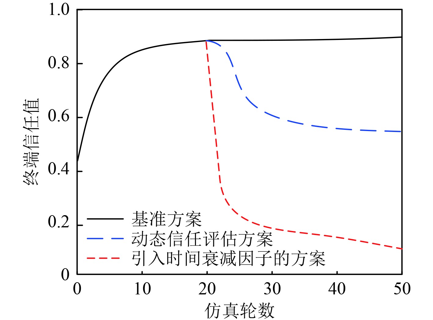 舰船物联网终端信任值是判别其是否可信的依据。将基础信任值方案作为基准方案,将其与引入时间衰减因子的方案、研究方法所用的动态信任评估方案进行对比,不同方案下,终端信任值在50轮实验下的变化情况如图3所示。分析得出,在前20轮实验中,3种信任评估方案下物联网终端信任值高于阈值,为可信终端,可成功接入舰船物联网。20轮以后,终端设备面临失陷威胁,基准方案计算出的信任值维持在0.9左右,终端设备始终能通过安全认证。引入时间衰减因子的信任评估方案终端信任值衰减较慢,且高于阈值,增加了失陷风险,给舰船物联网带来极大安全威胁;研究方法计算的动态信任值小于阈值,能够更快地对终端失陷威胁作出响应,实现不可信终端的成功拦截,有效提高舰船物联网的安全水平。